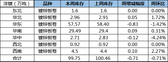 據(jù)來看,17日本網(wǎng)監(jiān)測(cè)國(guó)內(nèi)主要市場(chǎng)涂鍍板卷倉(cāng)庫庫存:鍍鋅99.75萬噸,較上周減少0.71萬噸,較上周環(huán)比減少