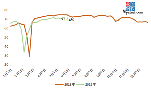 圖一:Mysteel全國(guó)鍍鋅板卷鋼廠產(chǎn)能利用率